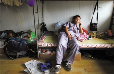 7月31日,京港澳高速旁河西再生水廠建筑工地,李川南躺在床上打電話。床下,放著慰問者送來的水果。