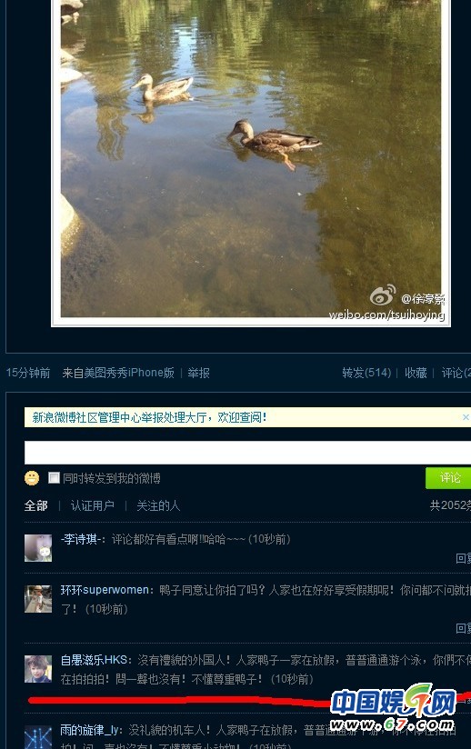 在徐濠縈最新的微博下面,諸多網(wǎng)友仿效“徐濠縈體”,用同樣的話回敬徐濠縈,稱其“不懂尊重鴨子”。