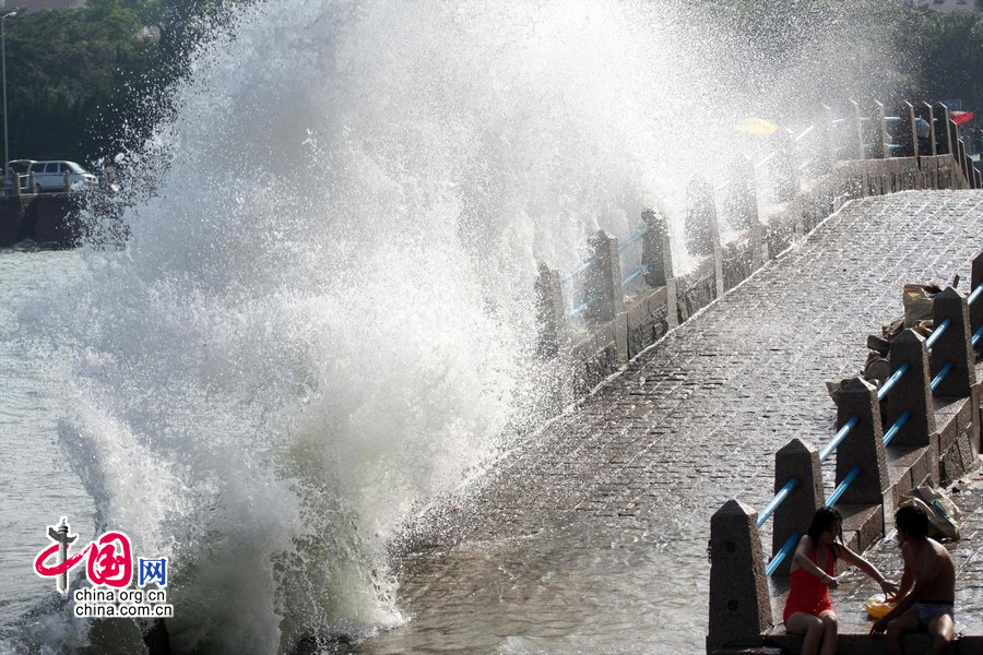 2012年8月1日,受臺風(fēng)影響,青島海濱掀起數(shù)米高的大浪,吸引了大批游人觀賞或下海沖浪。青島市氣象局介紹,今年第9號臺風(fēng)“蘇拉”、第10號臺風(fēng)“達(dá)維”逐漸形成“雙臺風(fēng)效應(yīng)”,有可能夾擊青島,從2日下午開始青島