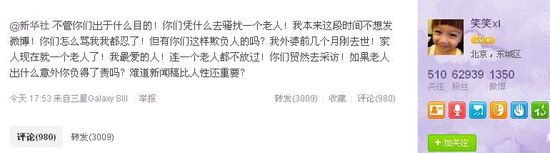 ????王曉理說,“不管你們出于什么目的!你們憑什么去騷擾一個老人!我本來這段時間不想發(fā)微博!你們怎么罵我我都忍了!但有你們這樣欺負人的嗎?我外婆前幾個月剛?cè)ナ?!家人現(xiàn)在就一個老人了!我最愛的人!連一個老人都不放過!你們貿(mào)然去采訪!如果老人出什么意外你負得了責嗎?難道新聞稿比人性還重要?”