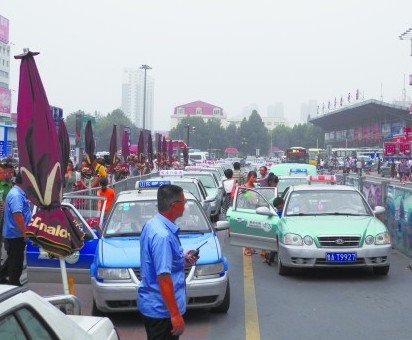 ????8月2日下午2時42分,記者來到濟南火車站,一走出車站就看見在出租車??奎c停著30多輛出租車,20多名乘客提著大包小包排隊等著上車。