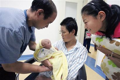 “破爛王”趙祥海的妻子于曰芳在昏迷無意識狀態(tài)下順產(chǎn)生下一對雙胞胎男嬰,上演了一段生命奇跡。昨日,家人抱著出院不久的老大趙恩永回到醫(yī)院做新生兒身體檢查并接種疫苗。利用這次機會,于曰芳第一次見到了兒子,當(dāng)她伸出右手抱恩永時,老趙也流下了幸福的淚水。目前,老二趙恩志仍在青醫(yī)附院接受