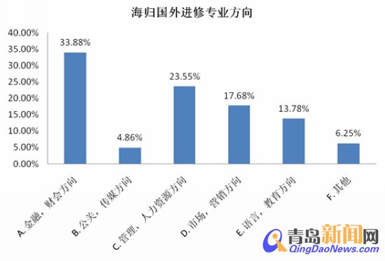 ??? 參與智聯(lián)招聘此次調(diào)查的海歸中,33.88%的海歸進(jìn)修的專(zhuān)業(yè)為金融/財(cái)會(huì),其次是管理/人力資源類(lèi)專(zhuān)業(yè),達(dá)到23.55%,海歸其他的主要進(jìn)修專(zhuān)業(yè)分別為市場(chǎng)/營(yíng)銷(xiāo)方向(17.68%)、語(yǔ)言/教育方向(13.78%)和公關(guān)/傳媒方向(4.86%)等。