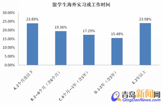 ??? 通過(guò)調(diào)查,我們還了解到,60.54%的海歸在海外留學(xué)期間的工作或?qū)嵙?xí)持續(xù)的時(shí)間多集中在1年以?xún)?nèi),其中實(shí)習(xí)在2個(gè)月及以下的為23.89%,2—6個(gè)月的為19.36%,6個(gè)月到一年的為17.29%。39.46%的海歸實(shí)習(xí)或工作超過(guò)1年。