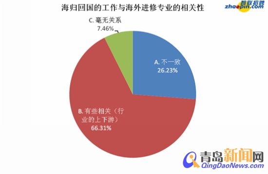 ??? 在已回國(guó)就業(yè)的海歸中,66.31%的海歸從事的工作與海外進(jìn)修專(zhuān)業(yè)相關(guān),工作與海外進(jìn)修專(zhuān)業(yè)毫無(wú)關(guān)系的海歸為7.46%,26.23%的海歸表示自己的工作與海外進(jìn)修專(zhuān)業(yè)不一致。