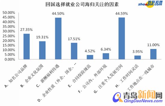 ??? 數(shù)據(jù)顯示,回國(guó)選擇就業(yè)公司時(shí),海歸最首先關(guān)注個(gè)人發(fā)展空間(44.59%)和公司的薪酬福利待遇(44.50%),另外知名公司品牌(27.35%)、企業(yè)文化氛圍(19.31%)和企業(yè)性質(zhì)(17.51%)也是海歸回國(guó)選擇單位時(shí)關(guān)注的主要因素。(本題為多選)