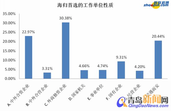 ??? 回國(guó)工作時(shí),30.38%的海歸青睞外商獨(dú)自企業(yè),22.97%的海歸偏好中外合資企業(yè),9.31%的海歸覺(jué)得國(guó)企也是個(gè)不錯(cuò)的地方,另有20.44%的海歸不在乎工作單位的性質(zhì),表示可以隨遇而安。