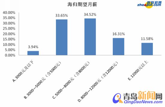 ??? 另外,智聯(lián)招聘調(diào)查顯示68.17%海歸對(duì)于月薪的期待在3000至8000元,其中,33.65%的海歸期望月薪為3000—5000元(含5000元),34.52%的海歸期望月薪在5000—8000元(含8000元)。期望月薪在8000-12000元(含12000元)的海歸占比16.31%,期望月薪在12000元以上的海歸占比11.58%,調(diào)查中只有3.94%的海歸期望月薪在3000元以下。