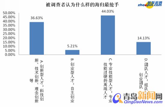 ??? 智聯(lián)招聘調(diào)查顯示,有44.03%的人認(rèn)為專(zhuān)業(yè)技能型海歸會(huì)比較搶手,其次是創(chuàng)新型海歸,達(dá)到36.63%,認(rèn)為團(tuán)隊(duì)人才和創(chuàng)業(yè)型人才會(huì)搶手的比例分別為14.13%和5.21%。