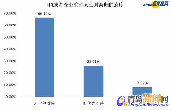 ????3.超七成企業(yè)HR或者管理人士表示不會(huì)優(yōu)先錄用海歸,海歸開(kāi)闊的視野最受他們欣賞 當(dāng)企業(yè)的HR或者管理人士在招聘是否會(huì)優(yōu)先考慮海歸時(shí),66.12%的人表示會(huì)一視同仁,平等對(duì)待;25.91%的人表示比較青睞海歸,而不喜歡海歸的HR和管理階層為7.97%。