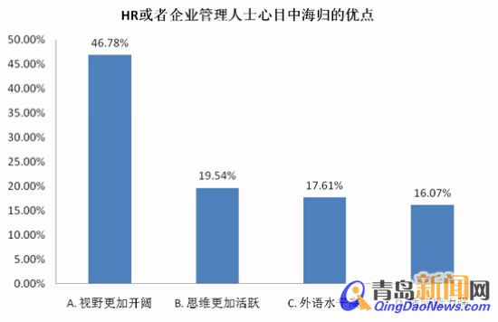 ??? 另外,智聯(lián)招聘也通過(guò)數(shù)據(jù)發(fā)現(xiàn),他們喜歡海歸更多的是因?yàn)樗麄儑?guó)際化視野更加開(kāi)闊(46.78%),另外思維活躍(19.54%)、外語(yǔ)水平高(17.61%)以及適應(yīng)能力強(qiáng)(16.07%)也是企業(yè)招聘人士偏好海歸的原因。