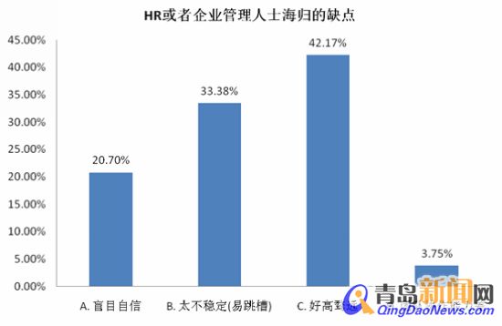 ????而他們不喜歡海歸的原因中,好高騖遠(yuǎn)居首,占比42.17%,容易跳槽不穩(wěn)定(33.38%)、盲目自信(20.70%)也是他們不喜歡海歸的主要原因,也有3.75%的人認(rèn)為海歸團(tuán)隊(duì)協(xié)作能力差。