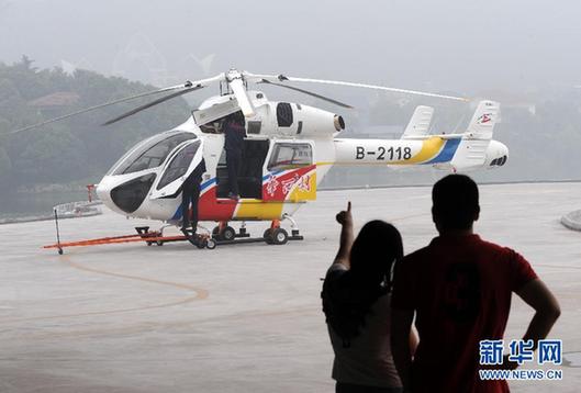 在位于華西村龍西湖景區(qū)的華西直升機(jī)場停機(jī)坪上,機(jī)務(wù)人員在對直升機(jī)進(jìn)行航前檢查(2011年6月5日攝)。