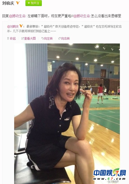 但是作為明星羽毛球隊(duì)名譽(yù)隊(duì)長的劉曉慶,球技受到網(wǎng)友懷疑,因?yàn)閯詰c打了幾下就將球拍打到自己臉上,左眼下方留下明顯瘀痕,險(xiǎn)些毀容。