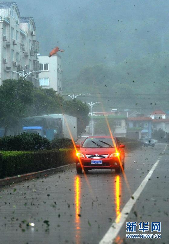8月7日,汽車在遭遇特大暴雨襲擊的浙江象山石浦鎮(zhèn)街區(qū)行駛。