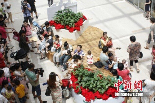 南京母乳媽媽的“快閃”活動(dòng)4日上午10:30在江東中路的萬達(dá)廣場(chǎng)進(jìn)行??扉W持續(xù)了10分鐘,之后媽媽們進(jìn)行了簡(jiǎn)單交流活動(dòng),并在現(xiàn)場(chǎng)散發(fā)了事先準(zhǔn)備好的衛(wèi)生部的《母乳喂養(yǎng)手冊(cè)》。