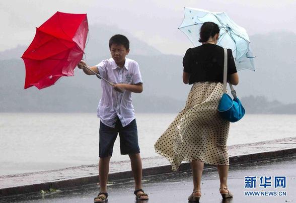 8月8日,在杭州西湖白堤,游客頂風冒雨艱難前行。