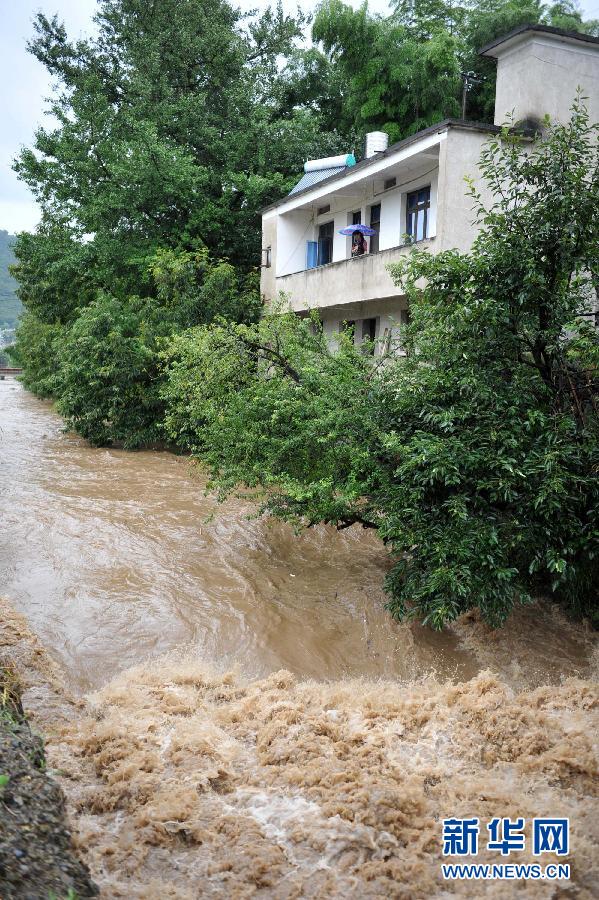 8月8日,浙江省臨安市島石鎮(zhèn)村民撐傘觀望奔流而下的洪水。