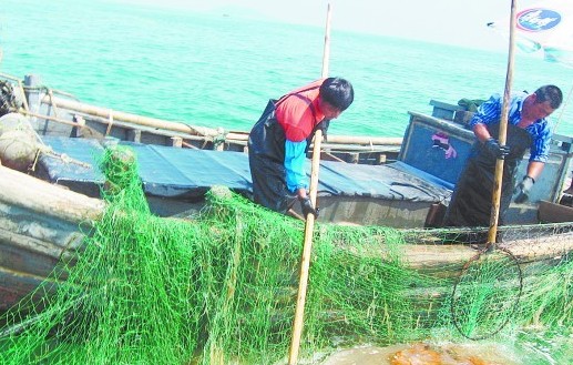 漁民將撞進(jìn)網(wǎng)里的海蜇?fù)频酱稀?/p>