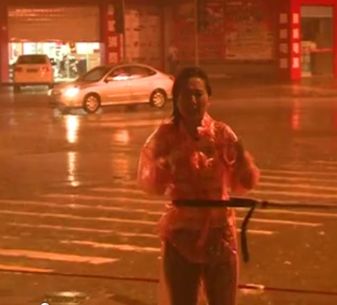 今年第11號(hào)強(qiáng)臺(tái)風(fēng)“??钡闹行挠?日3時(shí)20分前后在浙江省象山縣鶴浦鎮(zhèn)沿海登陸,登陸時(shí)中心附近最大風(fēng)力14級(jí)。在“海葵”登陸前20分鐘,寧波市氣象服務(wù)中心北侖追風(fēng)小組從北侖城區(qū)發(fā)回現(xiàn)場(chǎng)報(bào)道。為了防止被風(fēng)吹跑,出鏡女記者腰上栓繩進(jìn)行報(bào)道。即便如此,女記者還是無(wú)法站穩(wěn),甚至一度不得不蹲下。