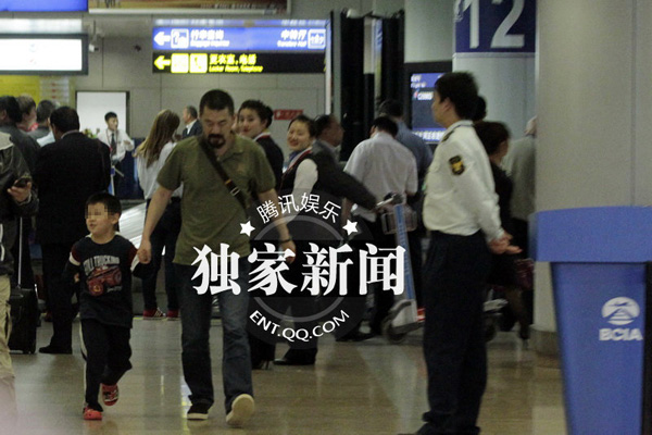 陳建斌和兒子手牽手首先走出閘口,等著蔣勤勤??礃幼?,兒子可能是有些旅途勞累了,撒嬌地?fù)硐蚋赣H,陳建斌單膝跪地,父子倆親切地?fù)肀г谝黄?,小家伙撅著小嘴,可?ài)