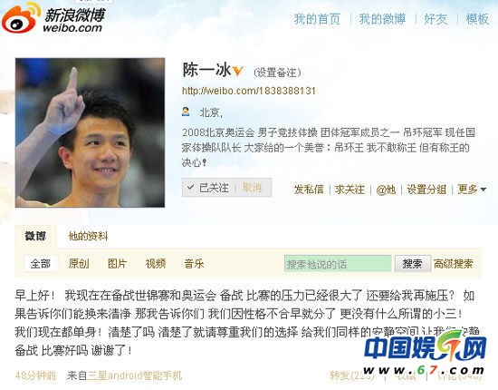 陳一冰通過微博承認(rèn)與何雯娜分手,強(qiáng)調(diào)并沒有小三存在。