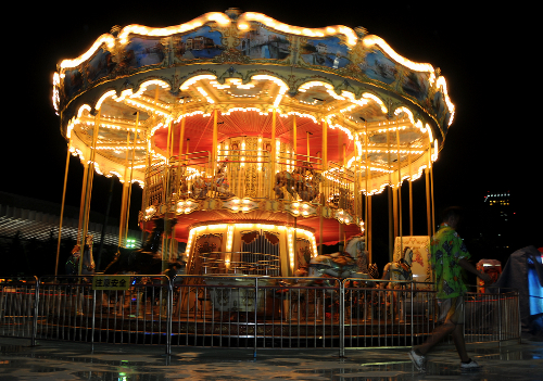 場地上,多姿多彩的燈樹美輪美奐,造型獨(dú)特的30余盞歐式環(huán)保庭院路燈處處流露著古典優(yōu)雅的歐陸風(fēng)情。8盞高亮度探照燈全力打造不夜城。35余盞高達(dá)6米的金屬鹵化燈和50余盞的圓形射燈點(diǎn)亮嘉年華各個(gè)角落,嘉年華設(shè)備群燈閃耀,僅摩天輪和跳樓機(jī)兩個(gè)設(shè)備上的燈就有萬余盞。夜幕降臨,華燈齊放,繽紛璀璨。