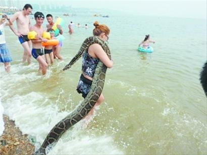 女子扛4米長蟒蛇海邊戲水 稱已喂養(yǎng)11年(圖)