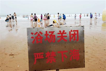 前晚,兩名來自河北的游客在開發(fā)區(qū)金沙灘海水浴場游泳時溺水,現(xiàn)場救生員和民警聯(lián)手救起1人,另外1人被海浪卷走。當(dāng)晚11時30分,該游客被發(fā)現(xiàn)后經(jīng)確認已溺水身亡。而僅僅兩天前,一名外地小伙也在金沙灘溺水身亡上演了悲劇。昨日,記者探訪發(fā)現(xiàn),受“達維”“海葵”等臺風(fēng)的影響,金沙灘海水浴場已連續(xù)11天發(fā)出 “封閉令”,但仍難阻擋游客下海游玩。