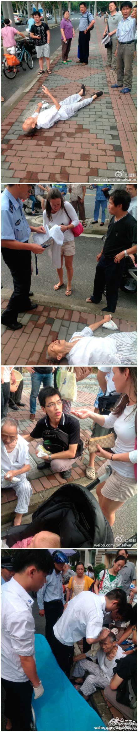 ????解放日報記者朱晨發(fā)布微博稱,今早八點在上海新華路淮海西路口,一老人躺倒在地,滿頭是血,圍觀路人無人敢扶,引來騎車經(jīng)過的一名外國女子破口大罵。