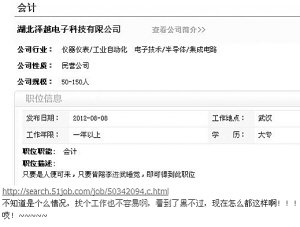 記者昨天上午登錄該網(wǎng)站看到,帖子發(fā)出的時間是8月8日晚上8點33分,發(fā)帖者為網(wǎng)友“hailiang85127”。網(wǎng)帖中有兩張前程無憂網(wǎng)的頁面截圖,內(nèi)容是:湖北澤越科技有限公司招聘一名會計,學(xué)歷要求大專,要求工作一年以上。