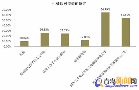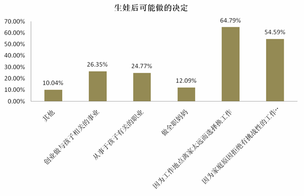 當(dāng)被問及在生育后最有可能做出的關(guān)于職場(chǎng)的決定時(shí),64.79%的女性表示她們會(huì)因?yàn)楣ぷ鞯攸c(diǎn)離家太遠(yuǎn)而選擇換工作,另外,接受調(diào)研的職場(chǎng)媽媽們表示會(huì)因?yàn)榧彝ピ蚨芙^有挑戰(zhàn)性的工作的占比54.59%,選擇創(chuàng)業(yè)做與孩子相關(guān)的事業(yè)的女性達(dá)26.35%,還有24.77%的女性表示會(huì)從事與孩子有關(guān)的職業(yè)。(此題為多選)