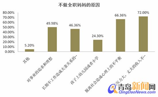 調(diào)查顯示,之所以不做全職媽媽,72.00%的人是因?yàn)樯顗毫Υ螅煞虻氖杖氩粔蛏?,其次是因?yàn)槊撾x社會(huì)造成心理上的不平衡(66.36%)。另外對(duì)事業(yè)的追求和理想(49.98%)、長期不工作造成夫妻關(guān)系的困擾(46.36%)以及孩子上幼兒園或者小學(xué)(24.30%)帶來充裕的空閑時(shí)間等也是他們不做全職媽媽的原因。
