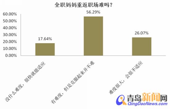 調(diào)查顯示,82.36%的女性認(rèn)為全職媽媽重返職場(chǎng)有難度,有26.07%的女性表示這種難度很大,會(huì)很不適應(yīng)。調(diào)查中有17.64%的女性表示可以很快適應(yīng)職場(chǎng)。
