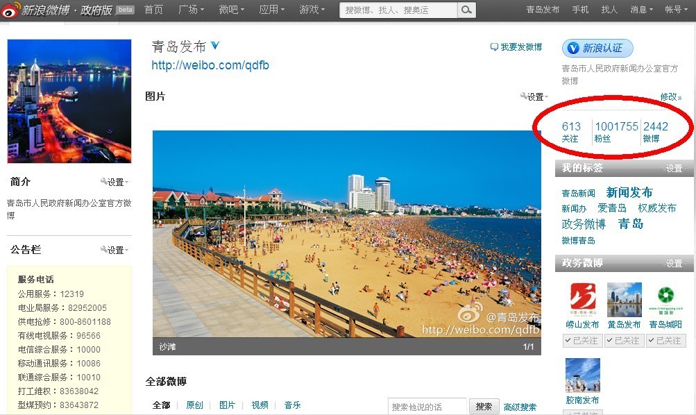 ????截至8月15日下午3時,“青島發(fā)布”已有粉絲1001687人,發(fā)布信息2442條,信息轉(zhuǎn)發(fā)總量近12萬次,評論3萬多條。????