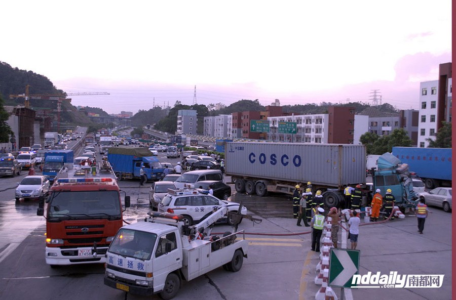 8月14日5時18分,深圳南坪快速轉(zhuǎn)水官高速布龍收費(fèi)站路段西往東方向,一輛滿載貨物的重型卡車疑剎車失控,順坡沖向排隊等候進(jìn)入高速路的機(jī)動車群,造成28輛機(jī)動車被撞擊。事故導(dǎo)致4人受傷,其中2人重傷。