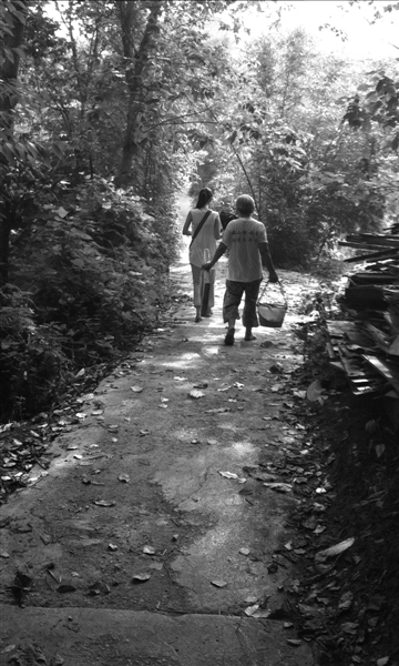 周克華的媽媽陳世珍走在村里的小路上。