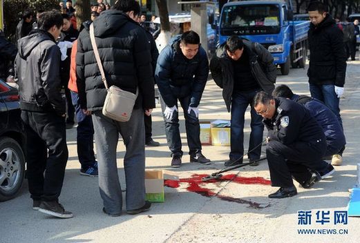 2012年1月6日上午10點左右,南京和燕路發(fā)生槍擊搶劫案。目擊者稱,一名男子提了30萬從銀行出來,被一槍打中腦袋,滿地鮮血。據(jù)報道,中彈市民已經(jīng)死亡。圖為事發(fā)現(xiàn)場。