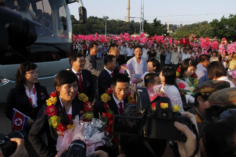 當(dāng)?shù)貢r間8月16日,獲得倫敦奧運會金牌的朝鮮運動員乘機回國。他們首先瞻仰設(shè)在機場的金日成和金正日太陽像,鞠躬致意。在駛向市區(qū)的數(shù)十里沿途都有朝鮮民眾夾道歡迎,慶祝朝鮮選手凱旋歸來。運動員代表發(fā)言時表示,將更加努力地訓(xùn)練,報答金正恩的巨大關(guān)愛和信任。