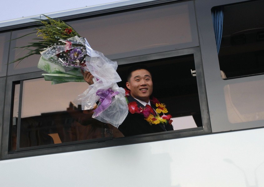 當?shù)貢r間8月16日,獲得倫敦奧運會金牌的朝鮮運動員乘機回國。他們首先瞻仰設在機場的金日成和金正日太陽像,鞠躬致意。在駛向市區(qū)的數(shù)十里沿途都有朝鮮民眾夾道歡迎,慶祝朝鮮選手凱旋歸來。運動員代表發(fā)言時表示,將更加努力地訓練,報答金正恩的巨大關愛和信任。