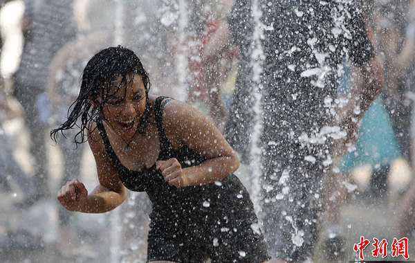 5月26日,北京三里屯的一處噴泉成為市民納涼嬉戲的好去處。當(dāng)天,據(jù)北京南郊觀象臺監(jiān)測顯示,15時(shí)北京的氣溫升到了33.2℃,創(chuàng)下今年以來氣溫新高。