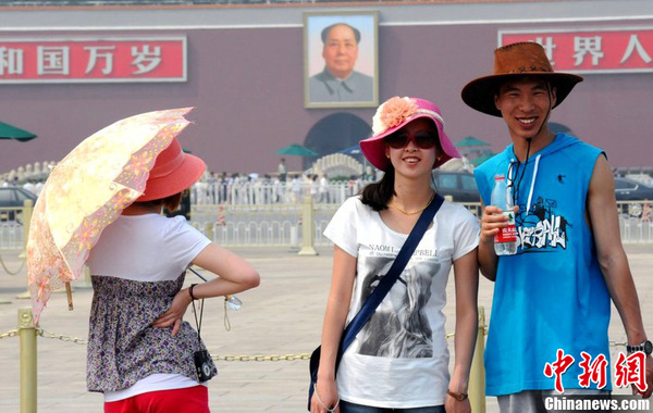 5月27日,北京驕陽似火,天安門廣場的游客及市民在烈日下休閑觀光,并用遮陽傘等物品抵御強烈紫外線的侵襲。