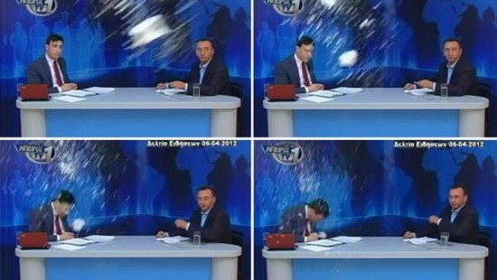 希臘主持人直播中被扔雞蛋 2012年4月,希臘西北部一群狂熱的左派份子沖進當?shù)匾患译娨暸_,向新聞男主播投擲雞蛋和酸奶,因為這名主持人邀請親納粹政治人物上談話節(jié)目。從畫面中可以看出,這名主持人在開始遭到“蛋襲”后,沒有立刻走開,也沒有做出躲避的動作,很鎮(zhèn)靜地坐在座位上。在連續(xù)遭到十幾次雞蛋和酸奶的襲擊后,他才緩緩地轉(zhuǎn)身離開。