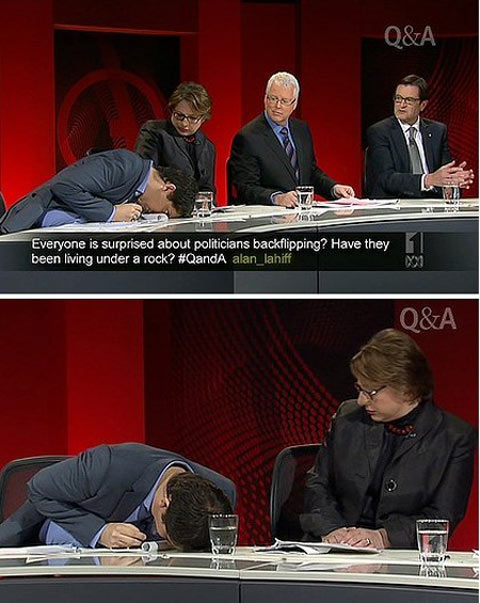 澳電視直播中一嘉賓暈倒鄰近嘉賓冷漠旁觀 2012年7月,在澳大利亞廣播電臺直播的“問與答”(Q&A)節(jié)目中,來自同性戀活動(dòng)團(tuán)體“GetUp!”的一位嘉賓突然暈倒在桌子上,不省人事。而坐他旁邊的一位女議員不僅沒有幫助,而是冷淡地打量,受到很多觀眾的批評。
