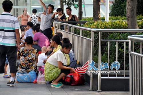 南昌火車站廣場(chǎng)上的綠化帶“石凳”被鋁合金柵欄圈了起來(lái),旅客“望凳莫及”,只好站著“休息”。