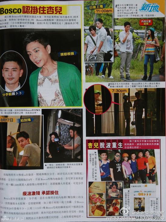 昔日為了盯緊黃宗澤,胡杏兒不惜由火炭轉(zhuǎn)租沙田晉名峰男友寓所樓上,惜Bosco不時(shí)被傳背女友偷吃,直至返內(nèi)地拍劇跟柳巖傳緋聞,杏兒忍無(wú)可忍,上月初正式分手。