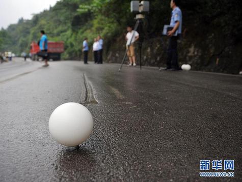 一枚事故現(xiàn)場(chǎng)掃描裝置的球型感應(yīng)器靜靜地立在事故貨車留下的剎車痕跡前(8月20日攝)。