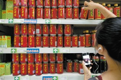 昨日,崇文門樂天瑪特超市內(nèi),兩種“紅罐”在貨架上并列。