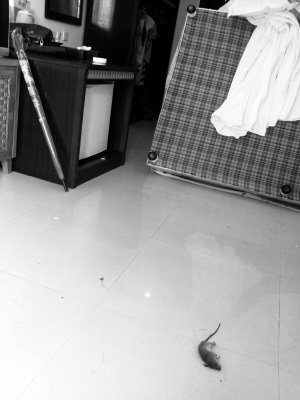 立起床,搬凳子,挪桌子,酒店的員工將整個(gè)房間“乾坤大挪移”,來了個(gè)地毯式搜索。終于,在房間的角落里看到了“嫌疑犯”。不過酒店的員工們忙了半天,也沒能抓到那只老鼠,最后還是王女士同行的兩名男人出手,才成功地將“嫌疑犯”當(dāng)場(chǎng)擊斃。