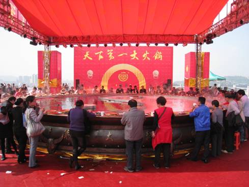 ?? 同時(shí),到會(huì)嘉賓和觀眾還可以品嘗到重慶德莊實(shí)業(yè)集團(tuán)擁有的吉尼斯和中華大擂臺(tái)電視基尼斯兩項(xiàng)世界紀(jì)錄的天下第一大火鍋現(xiàn)場(chǎng)制作的美味佳肴。據(jù)了解,該火鍋直徑10米,重13噸,由一紅一白兩條魚(yú)狀圖案組成太極鴛鴦鍋,大鍋外沿由56個(gè)鼎狀小鍋組成環(huán)形圈,象征我國(guó)56個(gè)民族的團(tuán)結(jié)、祥瑞、和諧。